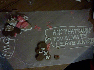 Here is what made me laugh and know he was doing an Arrested Development parody. This, of course, is J. Walter Weatherman, who is a one-armed man that is always giving lessons on the show that somehow involve him losing his fake arm in some seemingly horrific accident. If you can’t read the frosting, it says “And that’s why you always leave a note”.