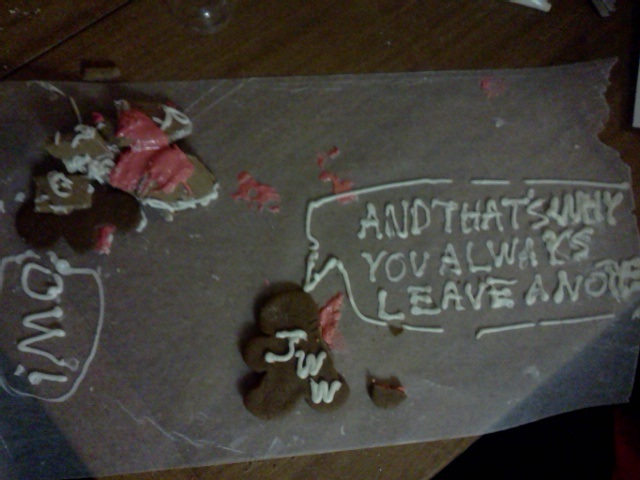 Part of the fun was decorating those premade gingerbread houses from Wilton and some gingerbread men. Eric tried to assemble one, but the frosting wasn’t holding it up right and it kept falling down. He finally was done trying to fix it and started getting creative. The following scene was born: